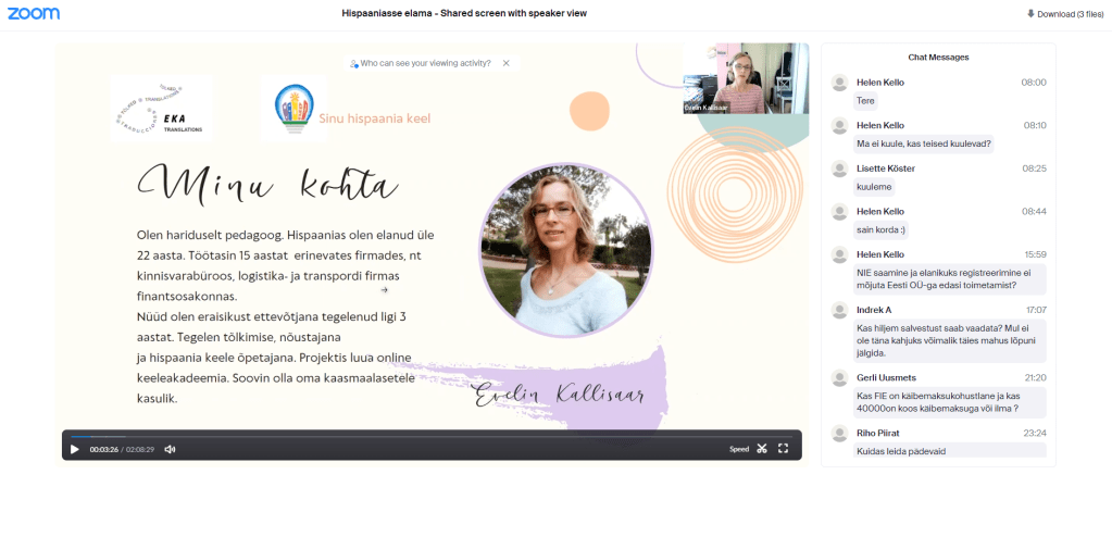 Hispaania keele online tunnid Zoomis nii täiskasvanutele kui lastele eesti keele baasil. Kasutame õpikut, aga teen ka ise palju interaktiivset õppematerjali juurde.